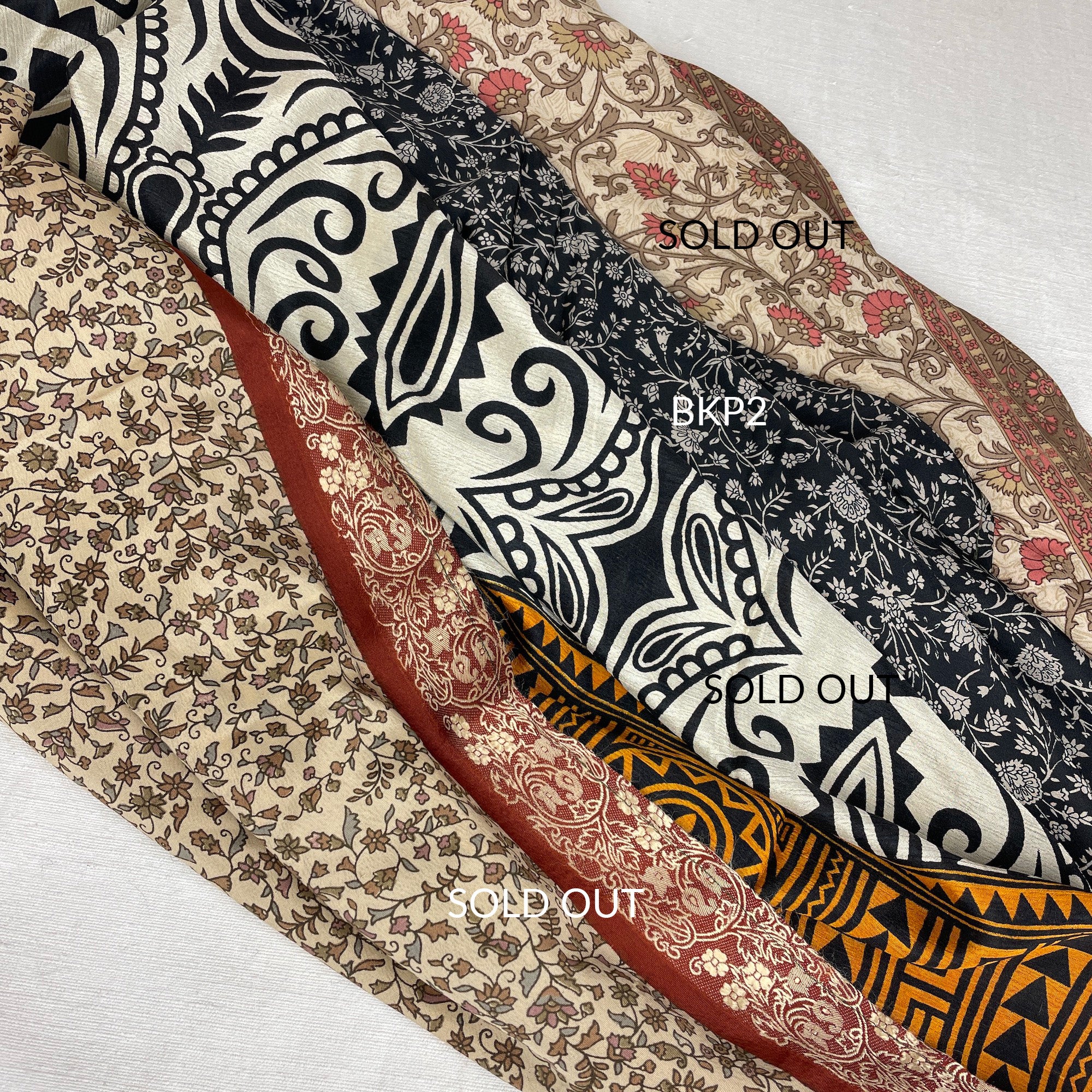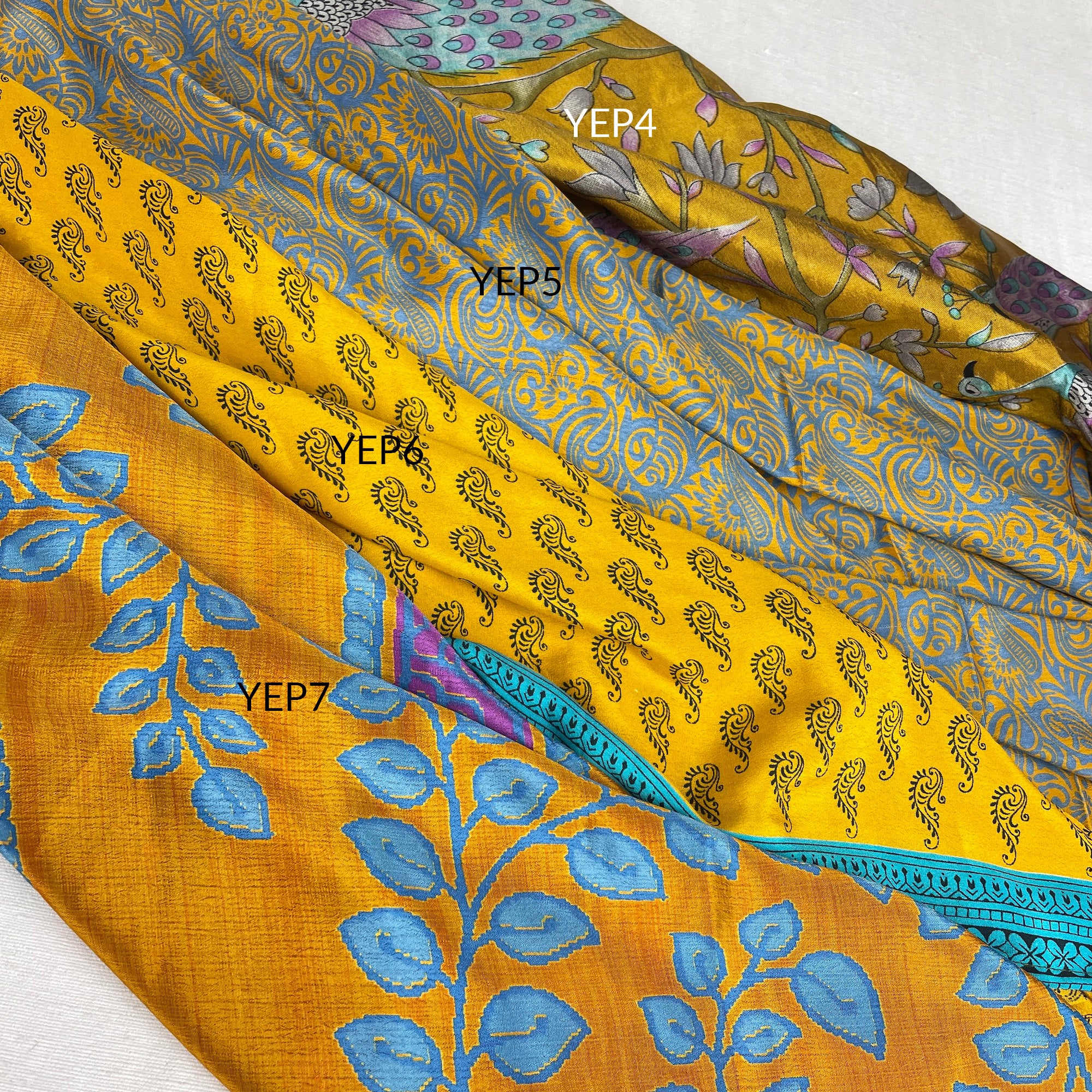 Our founder Laura is "like a kid in a sweet shop" when she visits fabric trader Dhiraj who supplies our recycled saris. In this treasure trove of vibrant colours, intricate patterns, textures and sparkles, it can be very difficult to choose! With intricate printed patterns and luxurious smooth textures, saris are works of art, often passed down families through generations. Nepali culture is very waste-conscious and re-purposing fabrics that have reached the end of one stage of their lives is commonplace. We have given these fabrics a new lease of life, and another chance to tell their stories. Every piece is one of a kind. Almost all options will contain some silk and some options will be 100% silk; as these are recycled fabrics, we do not have access to the individual composition per item. These products are not suitable for vegans.