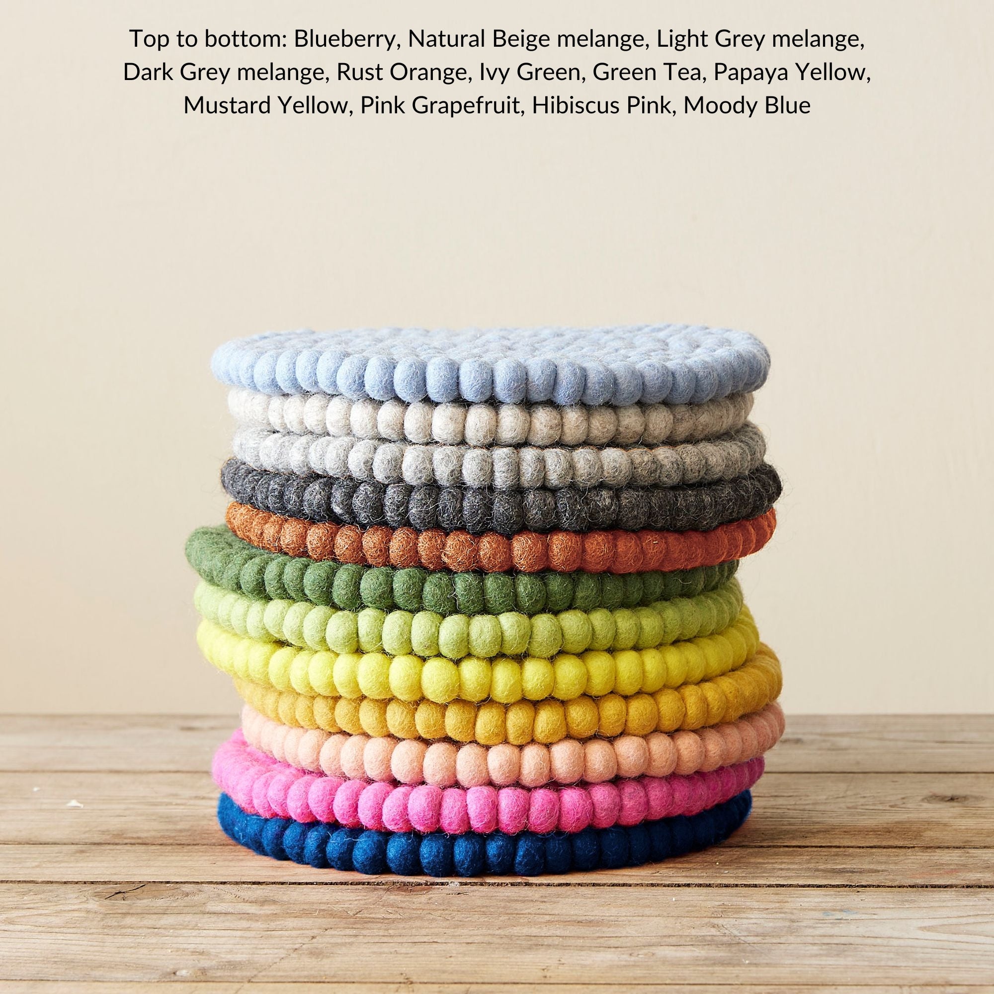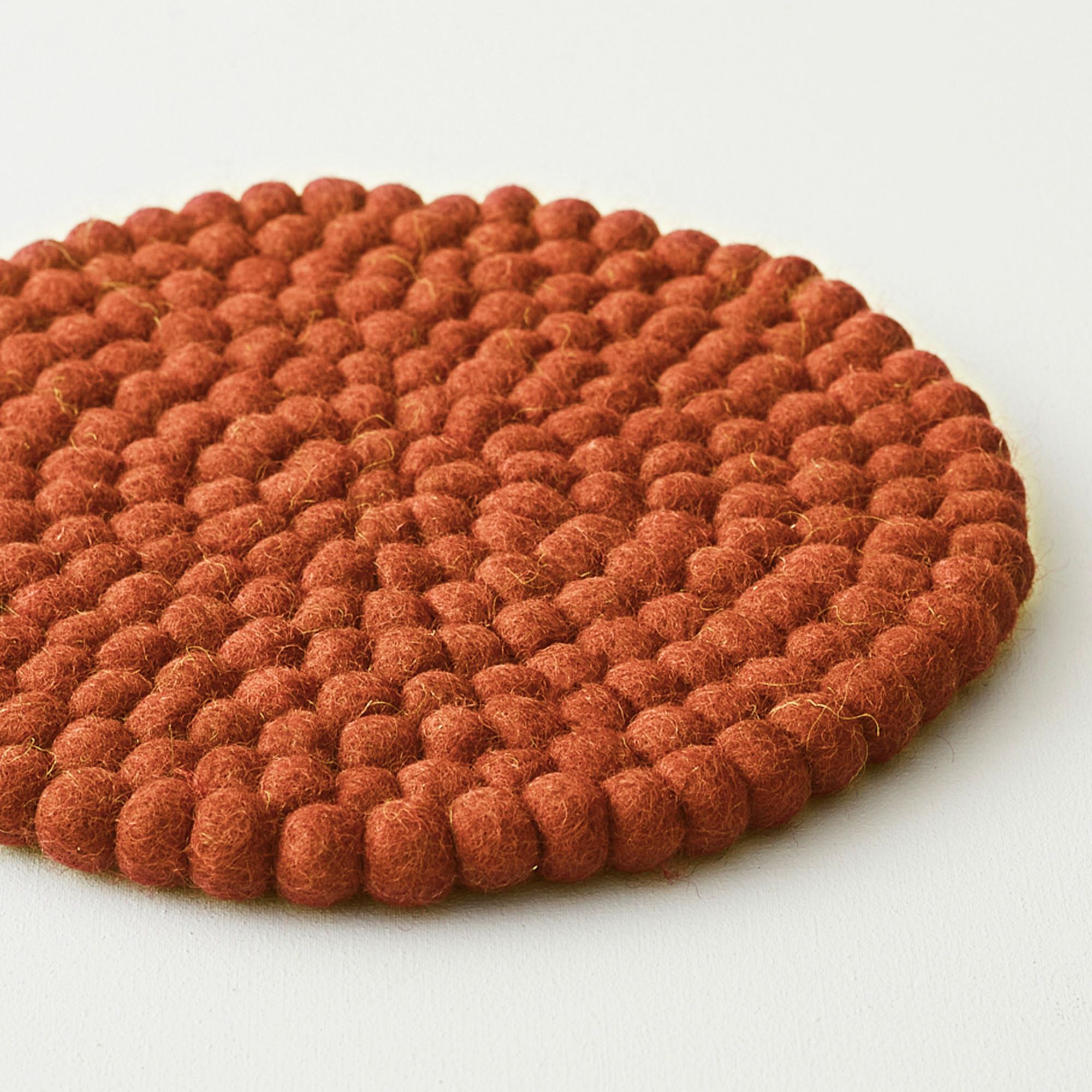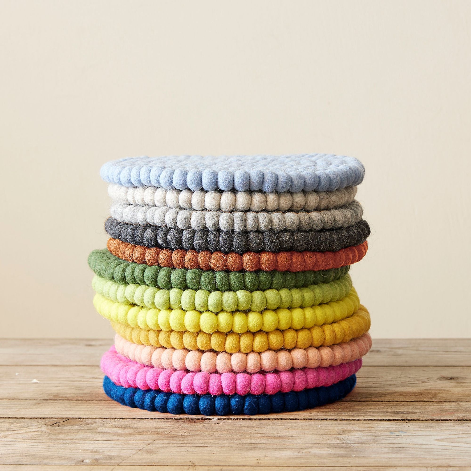 See other listings for matching items. Carefully hand-felted from 100% raw sheep wool with soap and water. The shades of grey, brown and cream are completely natural, while other colours are produced using azo-free dyes. Wool is a natural insulator, with high breathability, and it resists odours due to its natural antibacterial properties. Wool is one of the most sustainable fabrics in existence; renewable and biodegradable, it requires relatively little water for its production. Our wool is mulesing free. A strong thick thread is used to stitch the mats from the centre outwards with each ball secured to the next and to its inner neighbour. Read our blog post about how our felt ball tableware is made here. The thread is 100% cotton.