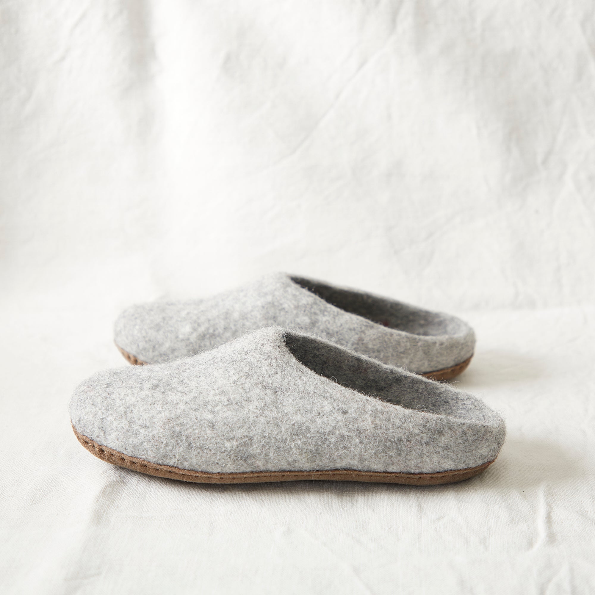 Our slippers are hand-felted by a women's co-operative in the Kathmandu Valley, Nepal. Each piece is made around a reusable 'resist' mould and felted by hand, then felted more around reusable resin EU size 'last' to give the consistent shoe size. They are dried in the sun and the suede sole is beautifully machine-stitched into place to finish each pair. AURA QUE has been working with the group since 2013. AURA QUE products are individually handcrafted and the unique story behind each AURA QUE product enhances its charm!