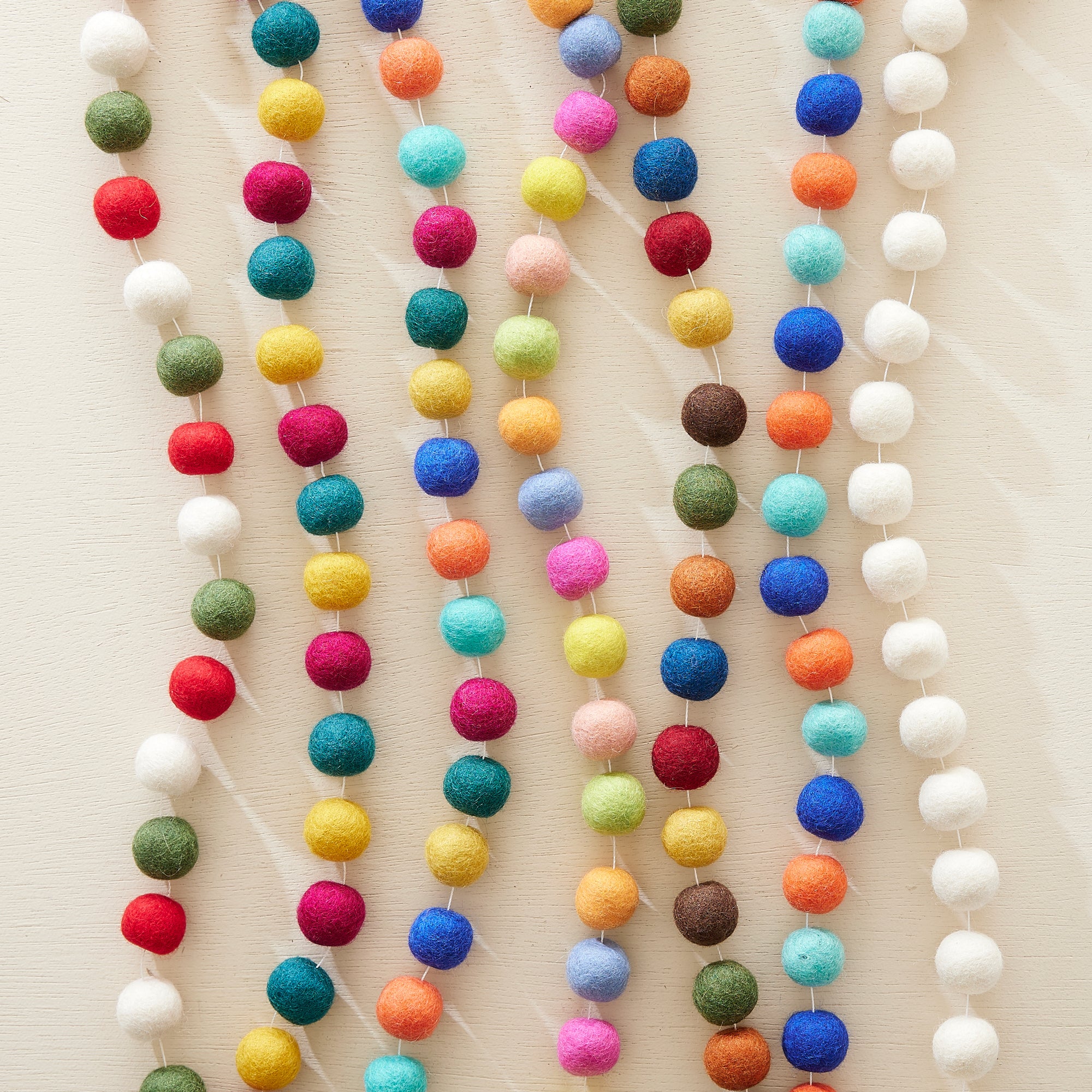 Packaged plastic free. Carefully hand-felted from 100% raw sheep wool with soap and water. The shades of grey, brown and cream are completely natural, while other colours are produced using azo-free dyes. Wool is a natural insulator, with high breathability, and it resists odours due to its natural antibacterial properties. Wool is one of the most sustainable fabrics in existence; renewable and biodegradable, it requires relatively little water for its production. Our wool is mulesing free. The decorations are not affixed and can be gently pulled along the waxed thread to reach your desired spacing; they grip the thread and remain in place unless moved. For safety reasons, keep out of reach of young children.